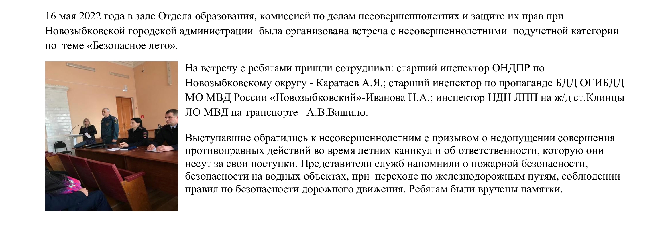В преддверье летних каникул 15.05.2023 года комиссией о делам несовершеннолетних и защите их прав при Новозыбковской городской администрации совместно со старшим инспектором ОНДРПР по Новозыбковскому городскому округу Каратаевым Алексеем Яковлевичем и инспектором НДН ЛПП на ж.д. ст.Клинцы Брянского ЛО МВД России на транспорте провели беседу «Безопасное лето» с несовершеннолетними особой категории. Ребятам напомнили и разъяснили о правилах пожарной безопасности, правила поведения на воде, правилах перехода через железнодорожные пути и правила поведения на дороге, по безопасности в сети Интернет, а так же о соблюдении комендантского часа с вручением памяток и буклетов.