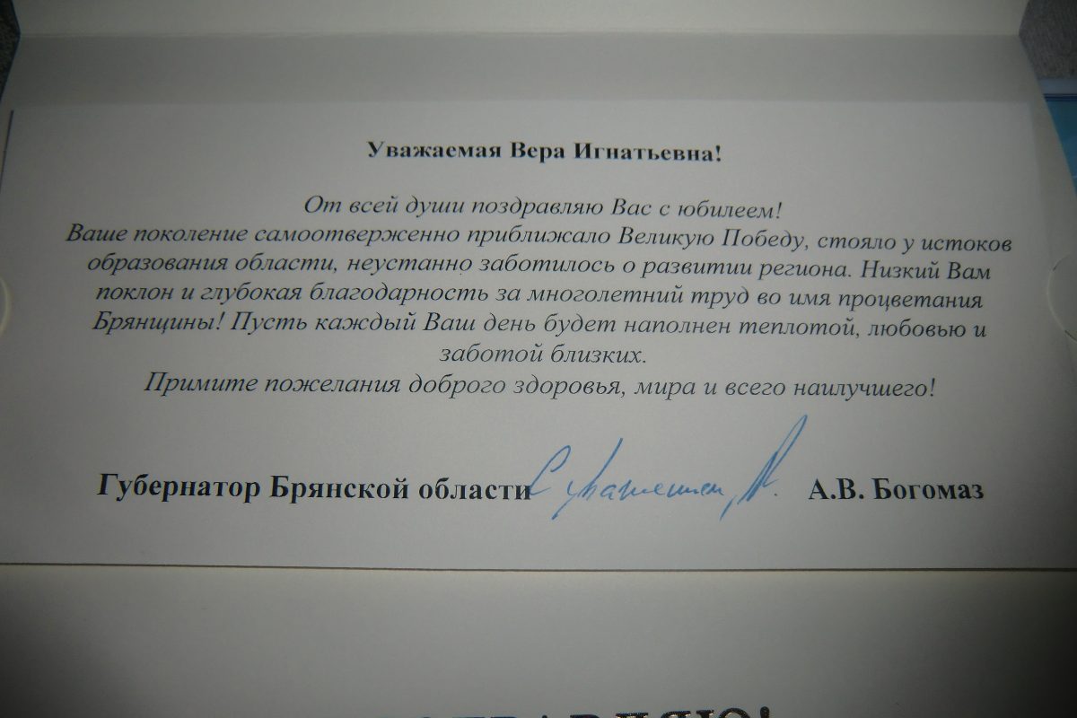 Сегодня глава Новозыбковского городского округа Александр Щипакин и глава Новозыбковской городской администрации Павел Разумный поздравили с 95-летним юбилеем Веру Игнатьевну Чернышевскую. Ей вручили открытки от Губернатора Брянской области Александр Богомаза и руководства Новозыбковского городского округа, цветы и подарок. Кроме того, в этот день Вере Игнатьевне пришло поздравительное письмо с Днём Победы от Президента России Владимира Путина.