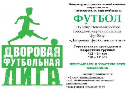 На футбольном поле физкультурно-оздоровительного комплекса открытого типа (ул.Первомайская,30) 4 августа 2021 г. состоится III турнир Новозыбковского городского округа по малому футболу «Дворовая лига».