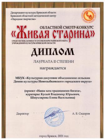 В Центре «Народное творчество» наградили победителей проекта «Живая старина». Новозыбковский городской округ представлял Манюковский Дом крестьянского быта. По итогам конкурса проект «Наша хата традициями богата» стал лауреатом второй степени. В конкурсе приняли участие 36 музеев, комнат и уголков крестьянского быта, созданные на базе культурно-досуговых учреждений, представив свой кураторский проект: местные обычаи гостеприимства и приготовления блюд, истории экспонатов из «бабушкиного сундука» и особенности традиционного народного костюма.В ходе экскурсии в доме крестьянского быта хозяйка - Сусло Марина Владимировна и хозяин - Кусый Владимир Юрьевич, рассказали гостям о том, как жили в селе, как обустраивали свой дом, чем занимались, как готовили еду. Предоставили возможность гостям самим поучаствовать в приготовлении пищи в русской печи, соприкоснуться с историей: достать чугунок из печи, люльку покачать, узнать, что такое «Бабий кут» и «Красный угол», познакомиться с традициями и обычаями гостеприимства нашего края, с домашней утварью и способами ее применения. "