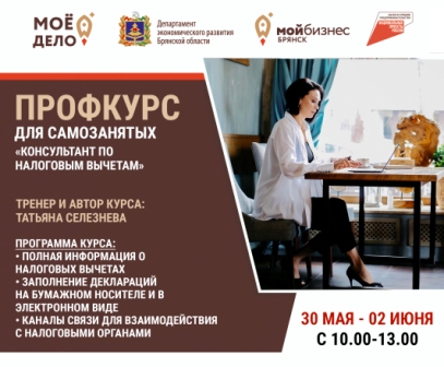Брянский областной «Центр оказания услуг «Мой бизнес», Департамент экономического развития Брянской области запускают серию бесплатных профессиональных курсов «Мое дело» для самозанятых Брянской области, а также для физических лиц, планирующих получить статус самозанятого. Мероприятия проводятся в рамках реализации национального проекта «Малое и среднее предпринимательство и поддержка индивидуальной предпринимательской инициативы».