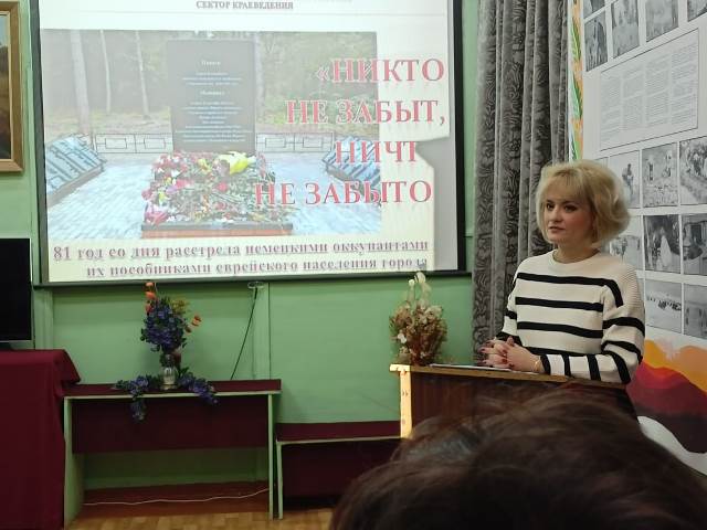 18 января сектор краеведения Центральной библиотеки имени князя Н.Д.Долгорукова провел для студентов Новозыбковского сельхозтехникума час памяти «Никто не забыт, ничто не забыто». Библиотекарь рассказала о том, как ровно 81 год назад 18 января 1942 года была расстреляна первая группа евреев г.Новозыбкова в Карховском лесу. Спустя много лет эту расправу над евреями назовут Холокостом. После освобождения города сразу началась работа по сбору информации о зверствах фашистов. Только в Карховском лесу было обнаружено семь братских могил с 2 860 трупами в них. Сейчас на этом месте стоит мемориал, возведенный в сентябре 2016 г. при содействии еврейских общественных и благотворительных организаций, администрации города, краеведов и поисковиков."