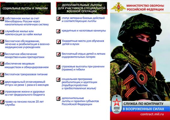 Служба по контракту — дело настоящих мужчин. Профессиональные защитники Родины это именно они — военнослужащие по контракту. Если вам от 18 лет и вы годны по стоянию здоровья Минобороны России предлагает вам поступить на военную службу по контракту. Что вы получите? Обширный спектр социальных льгот и гарантий. Это собственное жилье за счет Министерства обороны через накопительно-ипотечную систему, служебное жилье или компенсацию за наём жилья, бесплатное обследование, лечение и реабилитацию в военно-медицинских учреждениях, бесплатное обеспечение лекарственными препаратами, вещевым имуществом и обмундированием, бесплатное трехразовое питание, двухнедельный оплачиваемый отпуск (не реже 1 раза в полгода), страхование жизни и здоровья за счет федерального бюджета и право на пенсию после 20 лет службы."