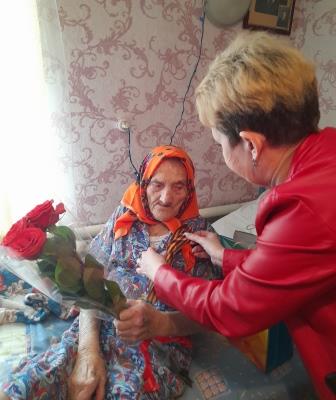 Юлия Викторовна Пушная, заместитель главы администрации по социальной политике, зачитала труженице тыла и ветерану труда тёплые поздравления от Губернатора А.В. Богомаза, главы округа А.В. Щипакина, главы администрации А.Г. Грека и вручила подарки юбиляру.