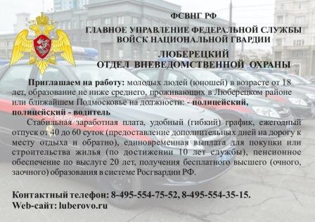 МО МВД России «Новозыбковский» приглашает на службу физически здоровых молодых людей в возрасте не моложе 18 лет до 50 лет на должности полицейского патрульно-постовой службы полиции, полицейского (водителя) группы обслуживания, инспектора-кинолога, полицейского отделения охраны и конвоирования подозреваемых и обвиняемых, инспектора службы группы режима специального приемника для содержания лиц, подвергнутых административному аресту, помощника оперативного дежурного дежурной части – имеющих среднее общее образование. Заработная плата от 31 000 рублей, а при условии добросовестного несения службы и положительных результатов работы до 50 000.