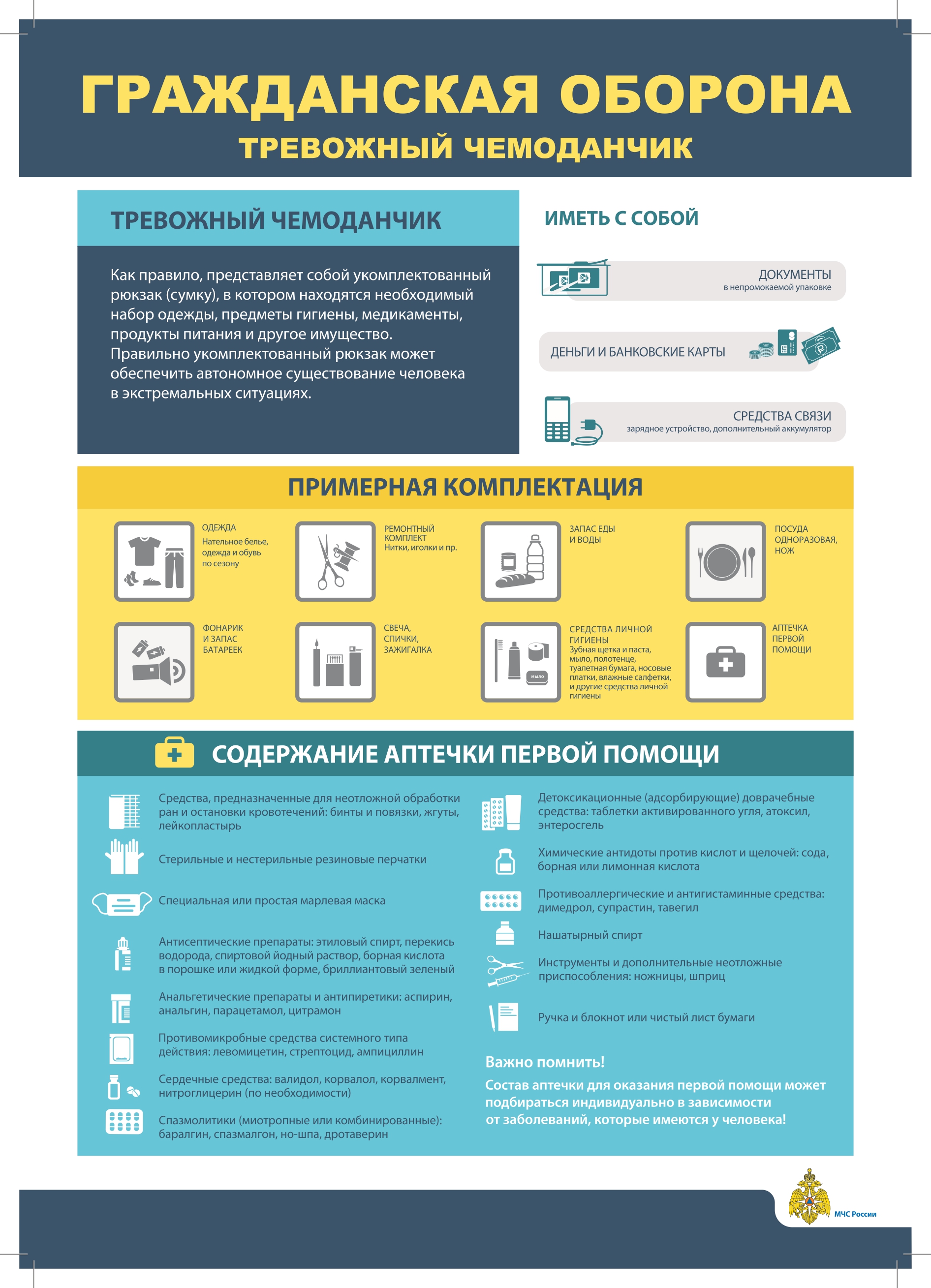 В «тревожном наборе» должны быть средства индивидуальной защиты, основные документы, продукты питания, вода, аптечка, сменная одежда, одеяло, телефон и некоторые другие необходимые принадлежности.