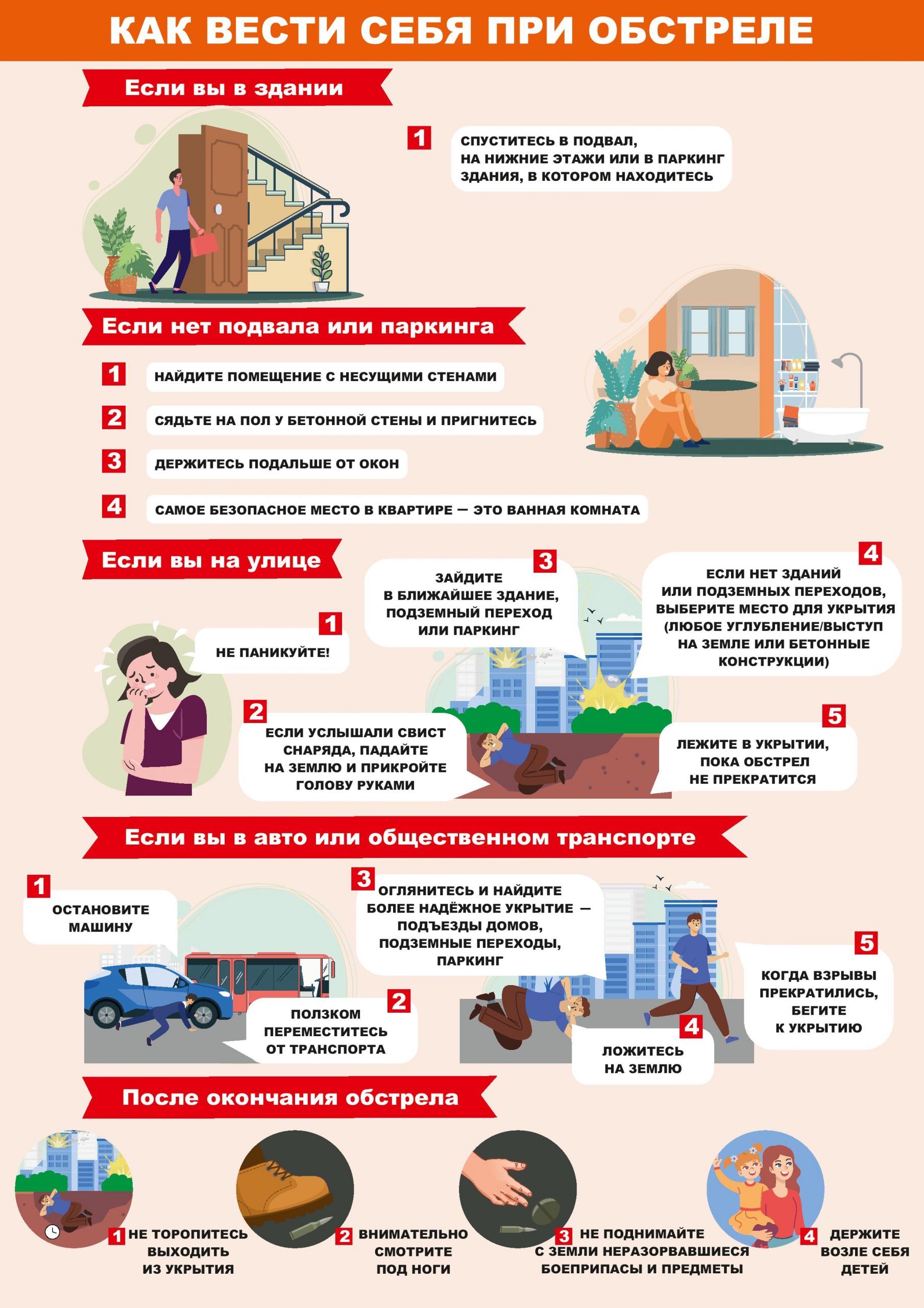 Действовать по указанию представителей органов власти, МЧС России или работников полиции. Соблюдать спокойствие и порядок. Проследовать в ближайшее укрытие.