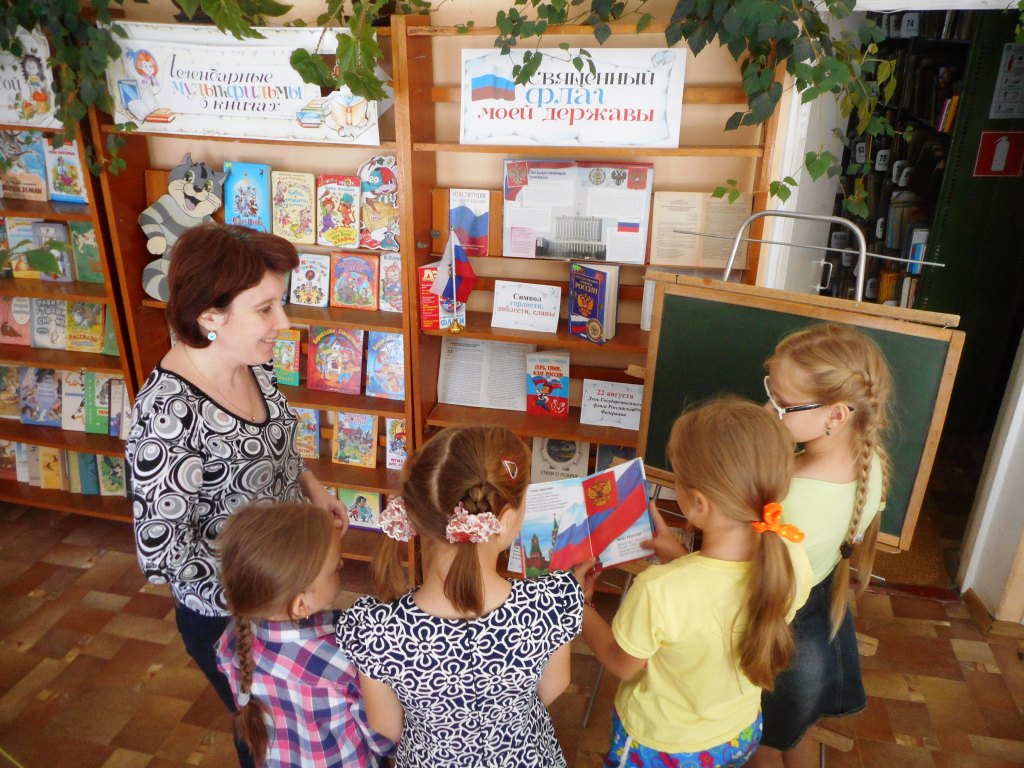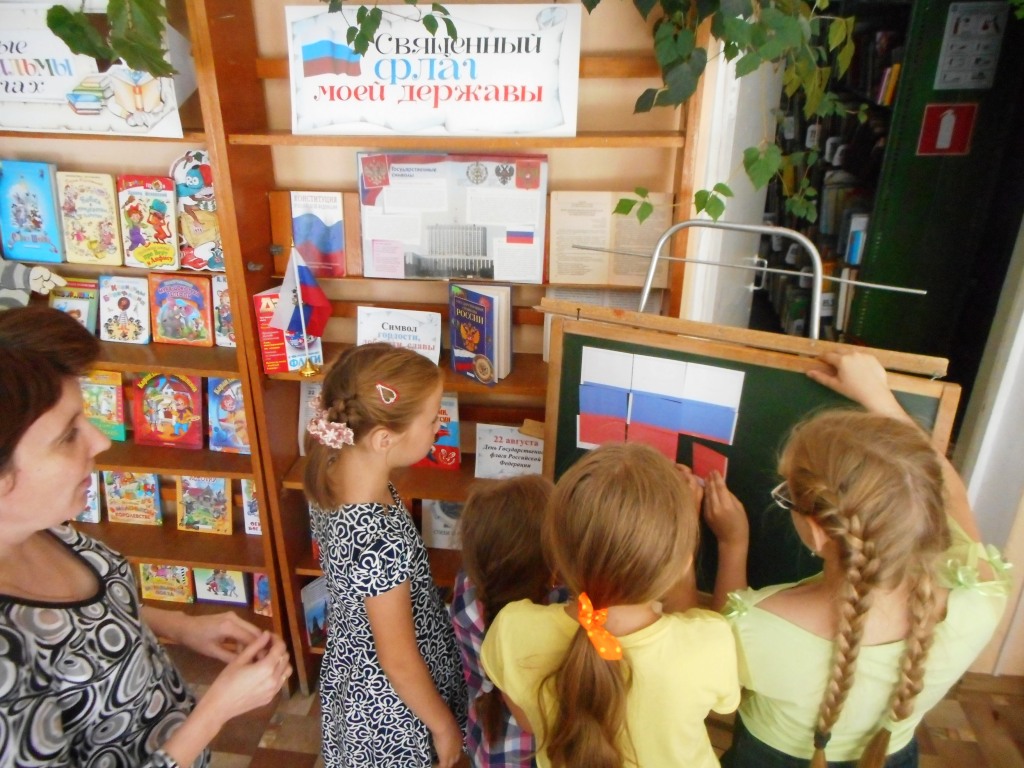 Для читателей Детской библиотеки была развернута выставка «Священный флаг моей державы». Библиотекарь рассказала маленьким россиянам, почему каждое государство имеет свой флаг и что он означает. Ребята узнали интересные сведения из истории флага России и о том, что означают его цвета. Участники мероприятия выразительно читали стихи о Родине, о флаге и собирали из пазлов изображение Российского флага.