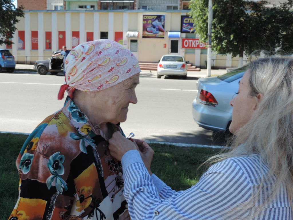 Утром журналисты новозыбковской газеты «Маяк» поздравляли горожан с Днём Государственного флага и прикрепляли прохожим ленточки с триколором.