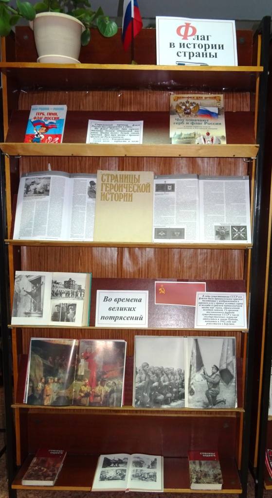 В холле Центральной библиотеки оформлен информационный стенд «История России в символах её», на абонементе работает книжная выставка «Флаг в истории страны».
