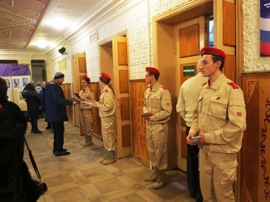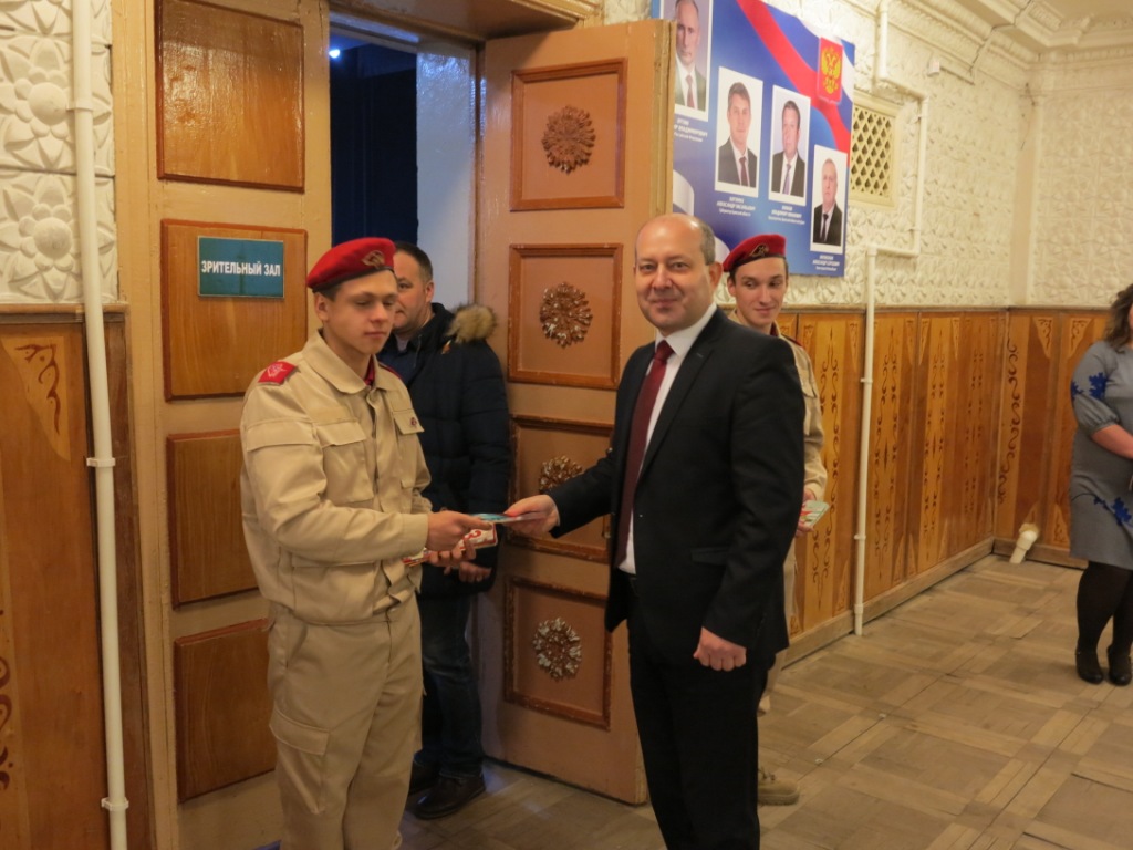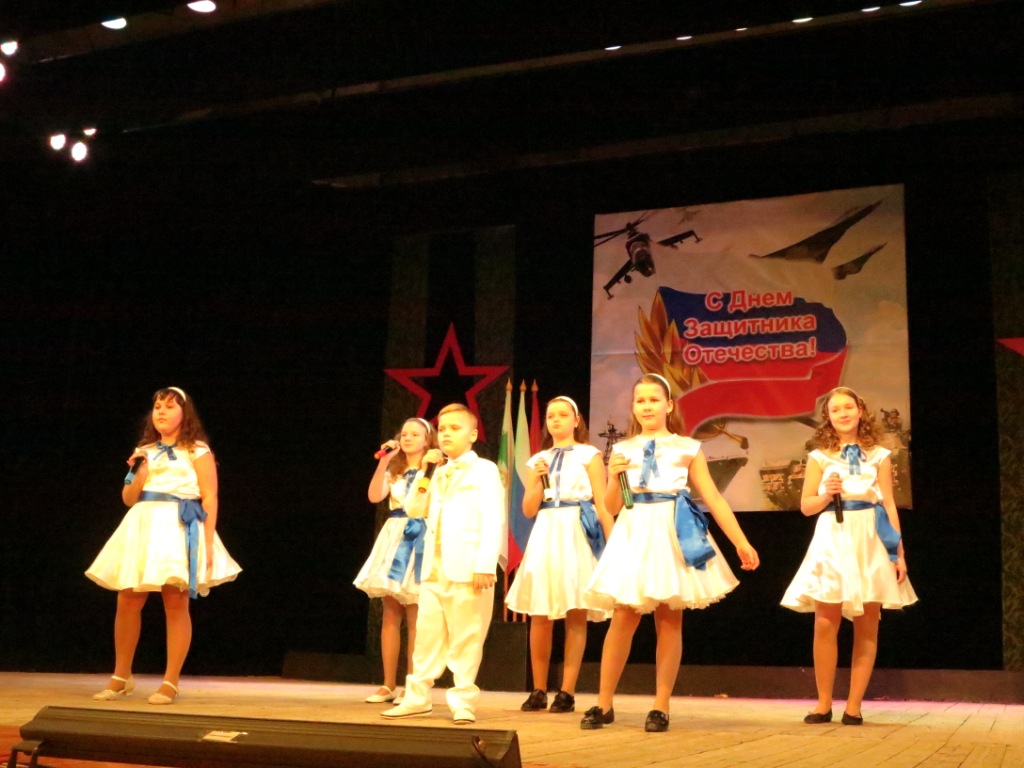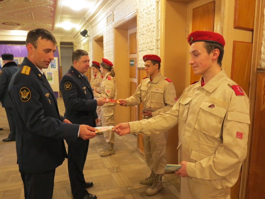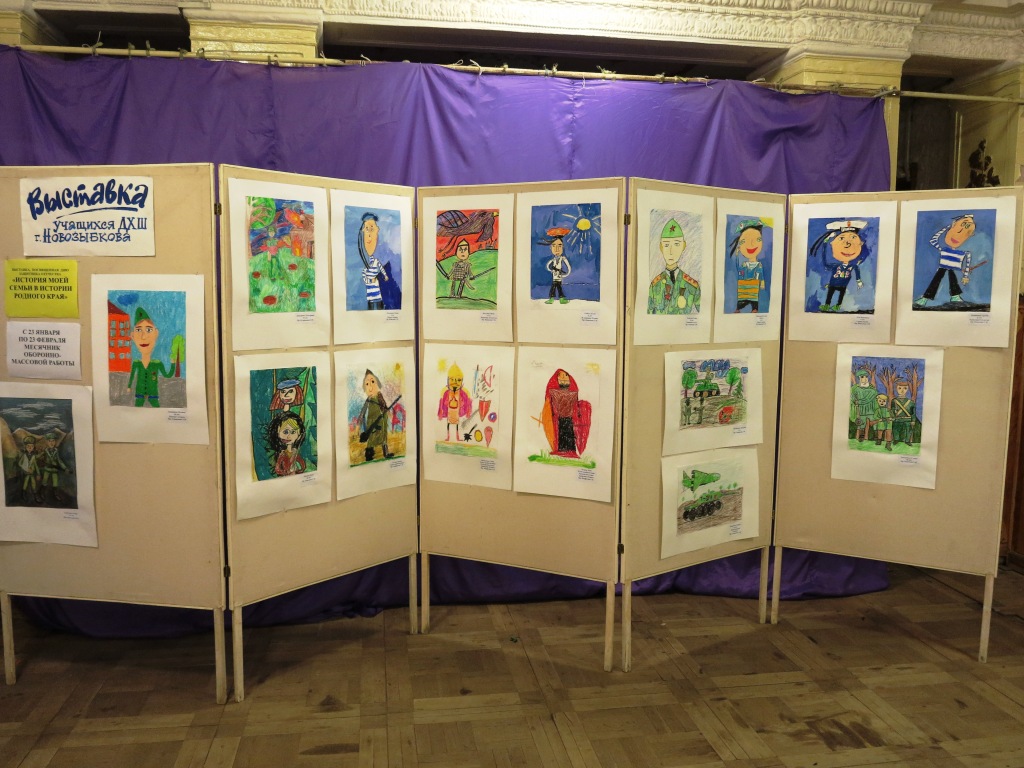 В фойе Дома культуры была организована тематическая выставка работ учащихся Детской художественной школы, юнармейцы поздравляли мужчин с праздником, вручали открытки.