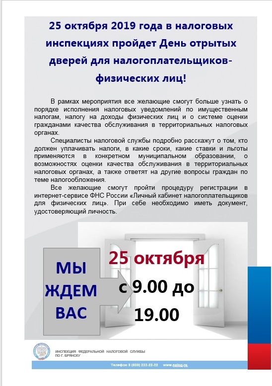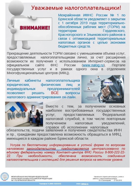 Межрайонная ИФНС России № 1 по Брянской области уведомляет о закрытии с 1 октября 2019 года территориально-обособленных рабочих мест (ТОРМ) на территории Гордеевского, Красногорского и Злынковского районов.
