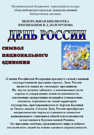 Сотрудниками МБУК «Новозыбковская городская централизованная библиотечная система имени князя Н.Д.Долгорукова» подготовлена виртуальная закладка «День России – символ национального единения», ознакомитmся с которой можно на сайте учреждения