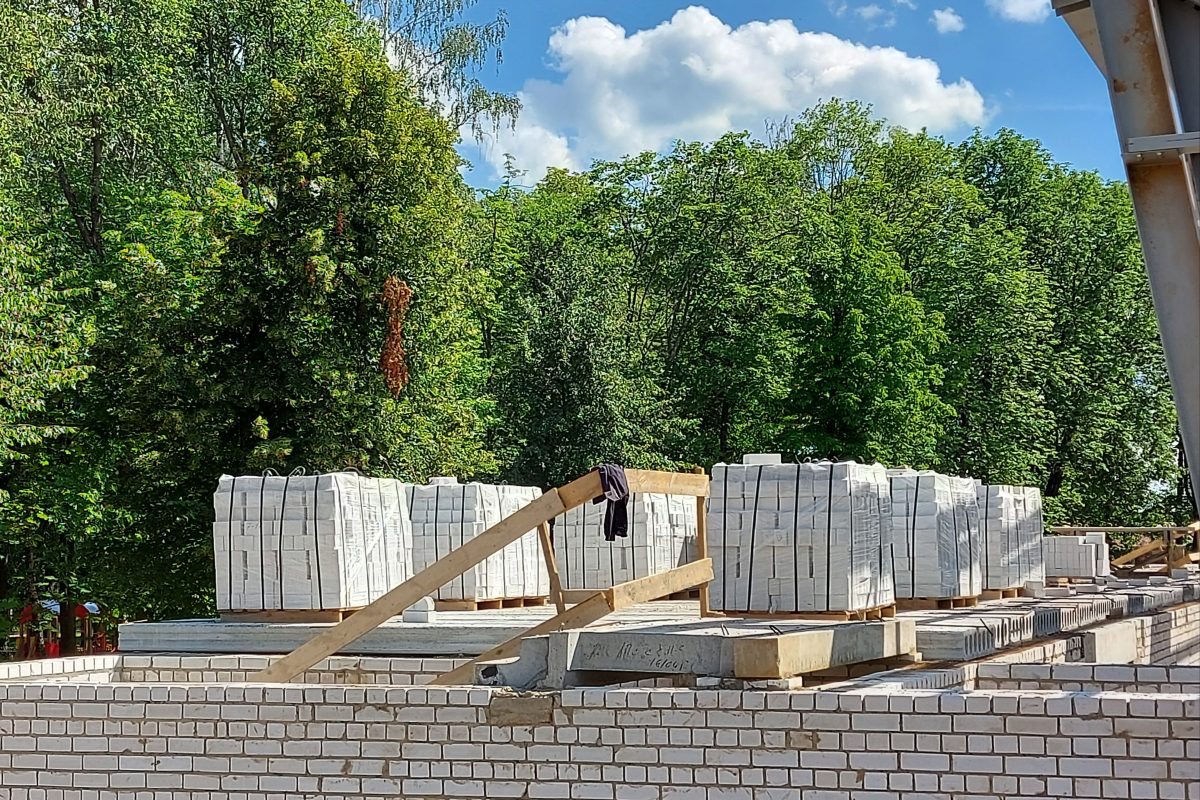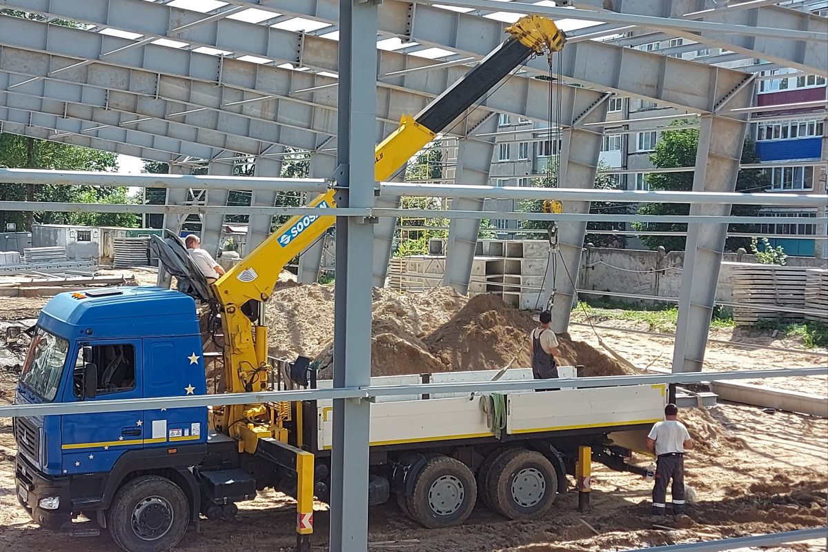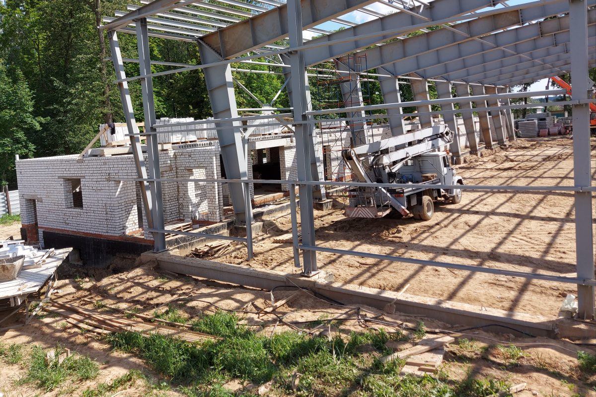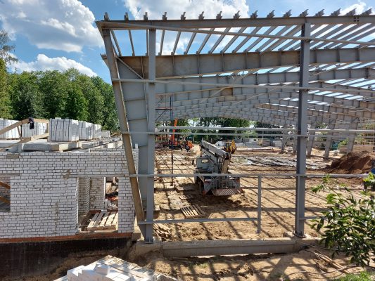 Крытый каток будет включать в себя 2 блока: одноэтажный блок ледовой арены и блок административно-бытовых помещений. На сегодняшний день уже завершена кладка первого этажа блока административно-бытовых помещений, а также монтаж несущих металлоконструкций ледового катка.