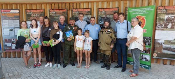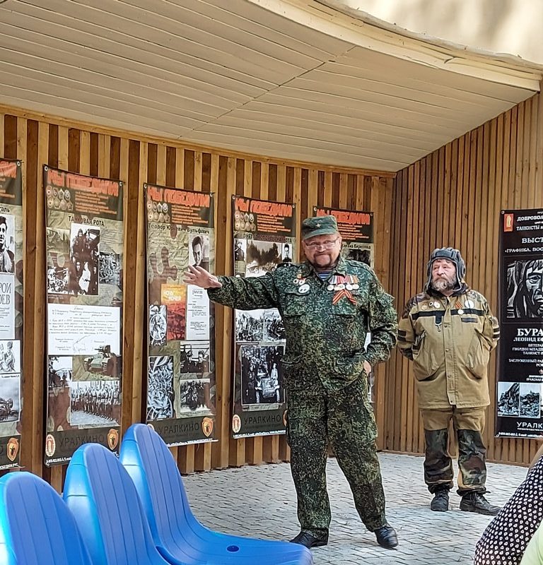 После этого Евгений Лохтин, председатель организации «Доброволец Урала» со своим единомышленником провели фотоэкскурс. Изюминкой фотовыставки стало исполнение Евгением Фёдоровичем песни «Уральский стальной чёрный нож». В конце мероприятия слово предоставили краеведу Евгению Свистову, который выразил слова благодарности в адрес организаторов выставки и вручил гостям город