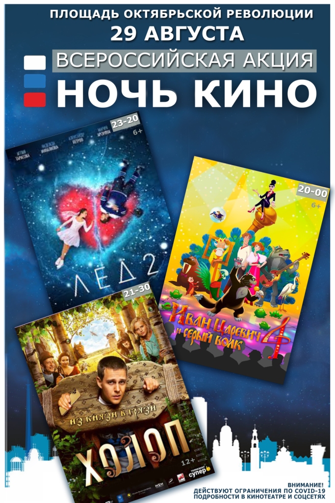 В программу кинопоказов в день акции войдут популярные отечественные картины последних лет: анимационный фильм «Иван Царевич и Серый Волк - 4», спортивная мелодрама «Лед-2» режиссера Жоры Крыжовникова и комедия режиссёра Клима Шипенко «Холоп».
