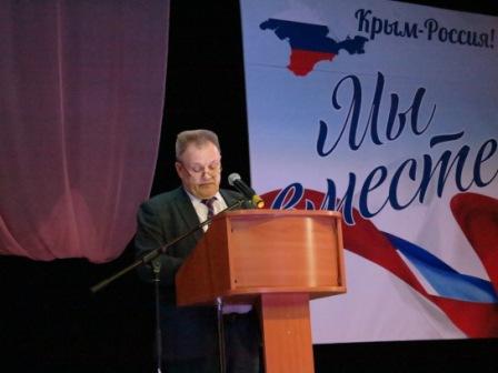 Жители Новозыбковского городского округа не остались в стороне от важной даты 18 марта – День воссоединения Крыма с Россией. Глава округа А.В. Щипакин и глава администрации П.В. Разумный отправились в Брянск, на Славянскую площадь, для участия в митинге, посвящённом "Крымской весне". Торжественное мероприятие в Новозыбкове было проведено в Городском Доме культуры им. Калинина. Приветствовал жителей округа первый заместитель главы Новозыбковской городской администрации В.М. Деньгуб. Виктор Михайлович в своём выступлении отметил, что в 2014 году жители Крыма ясно показали всему миру, что главным творцом истории является народ, объединённый такими общими идеалами, как любовь к Родине, ответственность за судьбу Отечества, уважение к истории своей страны."