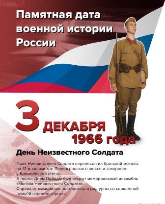 3 декабря в России отмечается памятная дата — День Неизвестного Солдата — в память о российских и советских воинах, погибших в боевых действиях на территории страны или за её пределами. Она введена федеральным законом «О внесении изменений в статью 1-1 Федерального закона «О днях воинской славы и памятных датах России» от 4 ноября 2014 года.