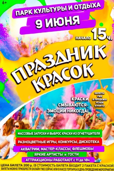 Посетите городской парк 9 июня в 15 часов – праздник красок – это всегда ярко и весело! Билеты можно приобрести уже сейчас! https://quicktickets.ru/novozybkov-dk/s168