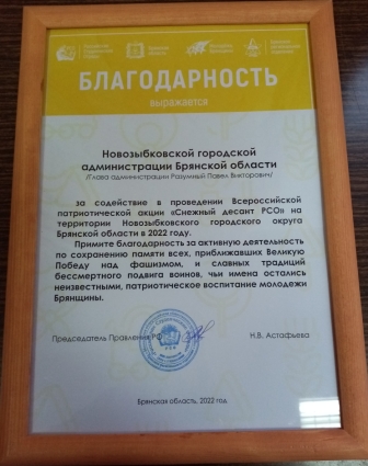Добровольцам понравился приём на Новозыбковской земле. В знак признательности председатель Правления регионального отделения «Российские студенческие отряды» Н.В. Астафьева выразила благодарность главе городской администрации П.В. Разумному за содействие в проведении Всероссийской патриотической акции «Снежный десант РСО» на территории Новозыбковского городского округа Брянской области в 2022 году, за активную деятельность по сохранению памяти всех, приближавших Великую Победу над фашизмом, и славных традиций бессмертного подвига воинов, чьи имена остались неизвестными, за патриотическое воспитание молодёжи Брянщины.