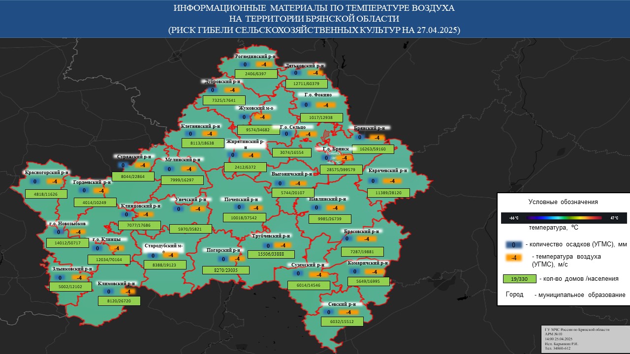 По данным Брянского ЦГМС утром 27 апреля, 28 апреля 2025 года ожидается опасное агрометеорологическое явление — заморозки. 27 апреля местами до минус 2 градусов, 28 апреля повсеместно до минус 4 градусов.
