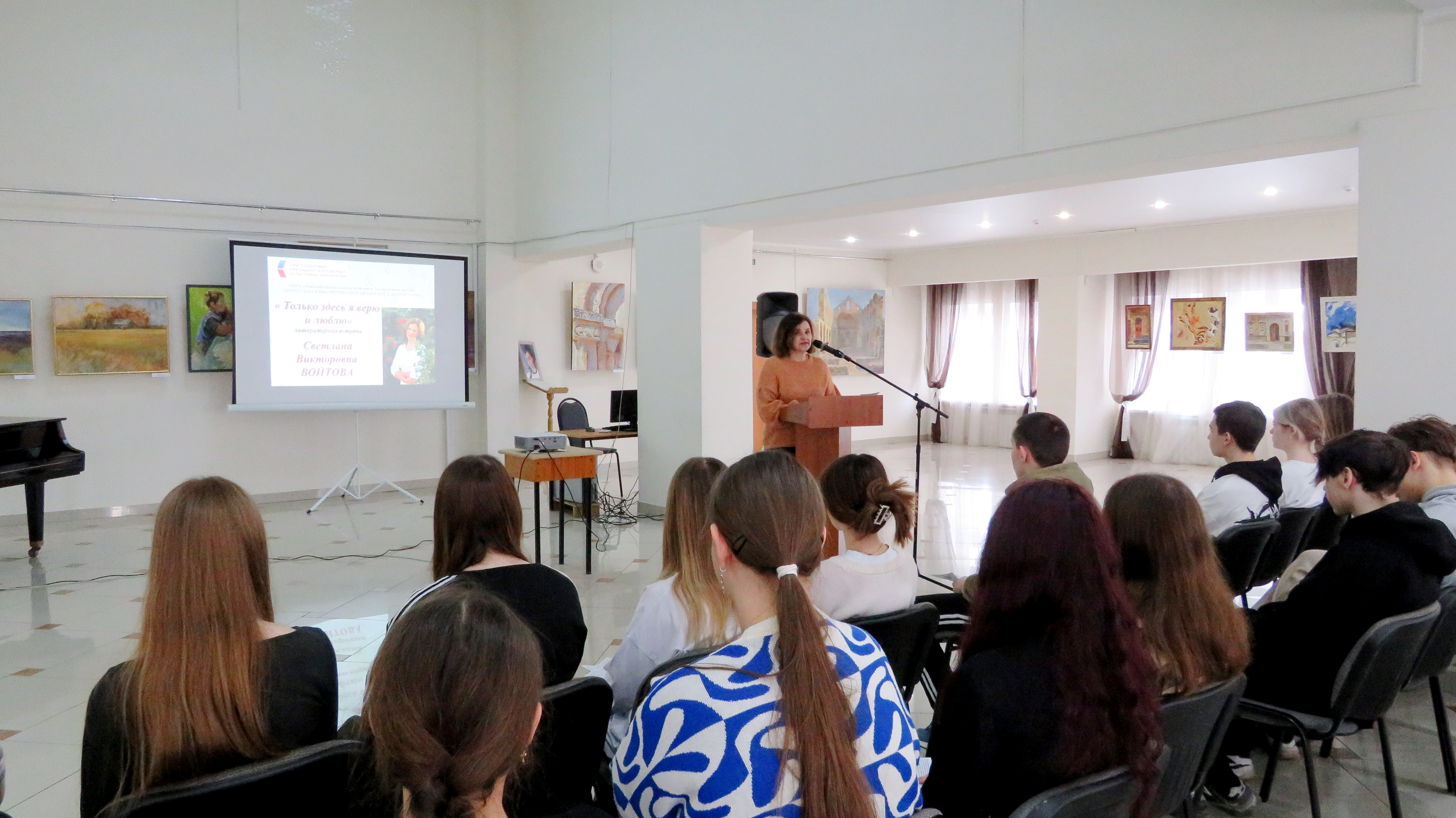В рамках проекта-победителя «Рандеву с поэтом: 25-й литературный праздник И. Швеца» при поддержке Президентского фонда культурных инициатив 18 марта в Центральной библиотеке имени князя Н.Д. Долгорукова состоялась литературная встреча «Только здесь я верю и люблю» с поэтессой Светланой Войтовой. В начале мероприятия специалист проекта по работе с молодежью Гусенок Елена Васильевна рассказала о жизни нашего земляка Ильи Андреевича Швеца. Далее рассказ коснулся поэтического наследия поэта, связанного с родными местами, с близкими и дорогими людьми, с первыми открытиями в жизни. Край детства – это любимые и дорогие сердцу места. Поэт – это человек, который постоянно вглядывается, вслушивается в свой внутренний мир, сверяет прошлое и настоящее, размышляет о добре и зле, печалится о несбывшихся надеждах. К их числу относится и Светлана Войтова, поделившаяся своими стихами со студенческой аудиторией. Как и наш известный земляк Илья Швец, она много пишет о любви к родному краю, красоте природы и любви к людям, живущим рядом с ней.