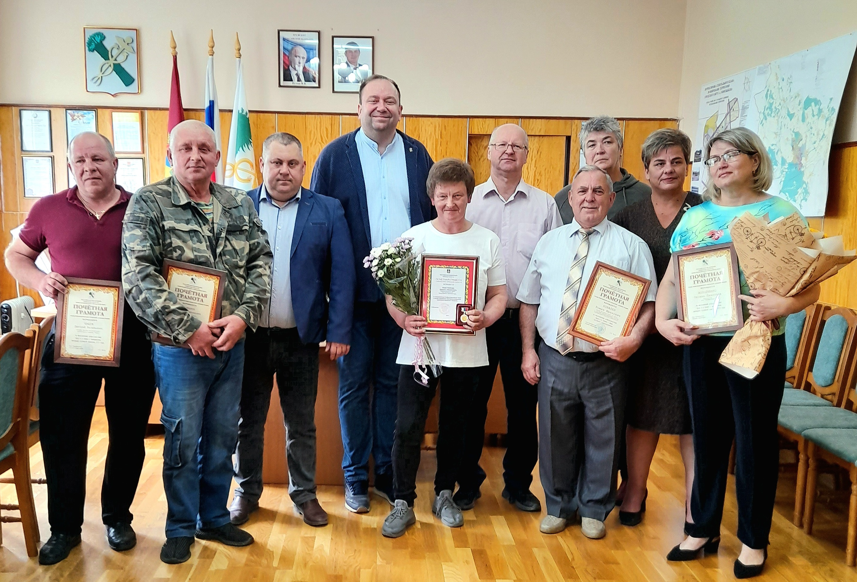 Почётной грамотой главы Новозыбковской городской администрации наградили в этот день работников ООО «Коммунар»: Оноприенко А.И , заместителя генерального директора, и Володченко Оксану Павловну, бухгалтера, а также работника СХПК «Ударник» Чемдуж Дмитрия Васильевича, заведующего зернотоком. У всех большой стаж работы в сельском хозяйстве и хорошие показатели."