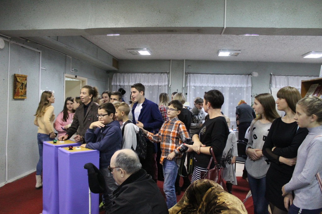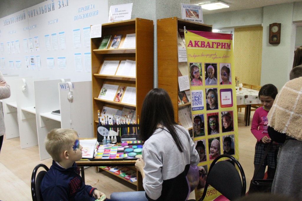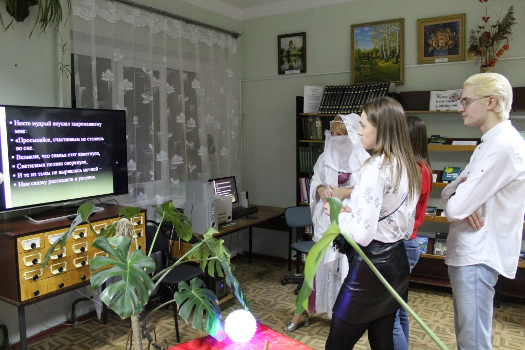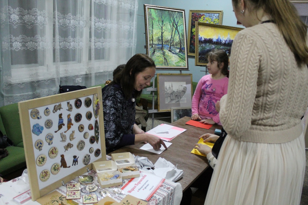 Традиционно в вечере приняли участие мастерицы и умельцы нашего города. Они представили в читальном зале на показ публике изделия из фоамирана, кожи, камня, кукол в народных костюмах, деревянные магниты, плетеные из газетных трубочек вазы и блюда. Здесь же расположилось и библиокафе «В шинке у Солохи», где девушки в красочных костюмах гоголевских вечеров близ Диканьки радушно встречали гостей чаем и плюшками. В это же время на интерактивной доске весело проходила театральная викторина, собравшая людей всех поколений. Это стало возможным потому, что вопросы были подобраны на любой возраст: от детей-малышей до умудренных старцев. Приятной неожиданностью для совсем маленьких гостей стала художница-аквагример, расположившаяся здесь же.