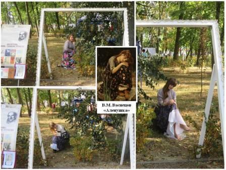 Посетители могли посмотреть небольшую планшетную выставку и рекламную сувенирную продукцию, посвященные князю-писателю. Все это было подарено центральной библиотеке Брянской организацией АНО «Визард», в проекте которой «Долгоруковские салоны» библиотека принимает активное участие, а также полистать книги В.Владимирова. Руководствуясь книгой «В былой Москве», а, точнее ее главой «Рetits jeux» (небольшие игры (фр.)), в которой автор описывает домашние развлечения «золотой» молодежи того времени с острой наблюдательностью человека, знавшего все это не как исследователь, но как современник и непосредственный участник, библиотекари организовали демонстрацию «живых картин», в которой новозыбковские дамы участвовали с огромным удовольствием. Они преображались в «Аленушку» Виктора Васнецова, нестеровскую «Девушку у пруда» и даже в модели импрессионистов. Насколько удачно это получалось, Вы можете увидеть, совершив экскурс в своеобразную «Картинную галерею», созданную нами из фото, сделанных на празднике.