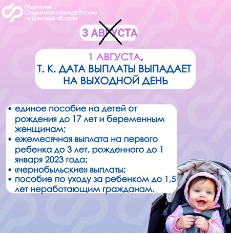 В августе Отделение Социального фонда России по Брянской области начнет выплату детских пособий 1 августа, так как плановая дата — 3 августа — приходится на выходной день.