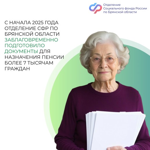 Отделение Социального фонда России по Брянской области проводит с жителями региона заблаговременную работу по оформлению документов, необходимых для назначения пенсии. С начала 2025 года такая работа была проведена с 7154 гражданами.