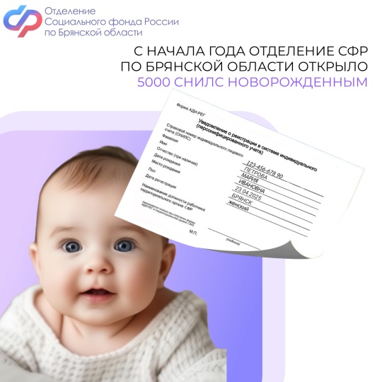 С начала 2025 года Отделение Социального фонда России по Брянской области открыло более 5 тысяч СНИЛС новорожденным в проактивном (беззаявительном) режиме на основании сведений, поступивших из органов ЗАГС.