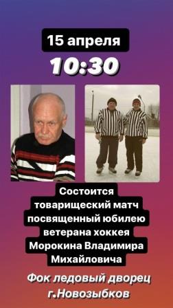 15.04.2023 г. на ледовой арене Дворца спорта (г.Новозыбков, ул.Гагарина, 8 А) состоится товарищеский хоккейный матч между сборными ветеранов и молодёжи, посвящённый юбилею ветерана хоккея Морокина Владимира Михайловича. Начало матча: в 10.30 |