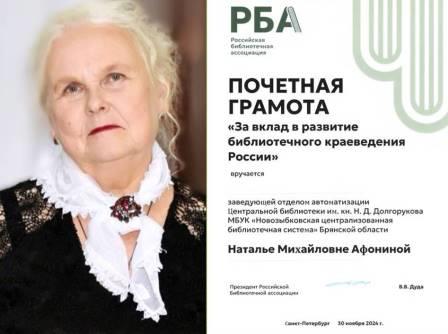30 ноября в «День Ивана Сусанина» – профессиональный праздник библиотекарей-краеведов России – по инициативе Секции «Краеведение в современных библиотеках» РБА, объявлены имена специалистов, которые награждены Почётной грамотой РБА «За вклад в развитие библиотечного краеведения России» и Благодарственным письмом Президента РБА за большие достижения в профессиональной краеведческой деятельности. Поздравляем Афонину Наталью Михайловну, Заслуженного работника культуры Брянской области, библиотекаря Центральной библиотеки имени князя Н.Д. Долгорукова, краеведа с награждением Почетной грамотой Российской библиотечной ассоциации «За вклад в развитие библиотечного краеведения России».