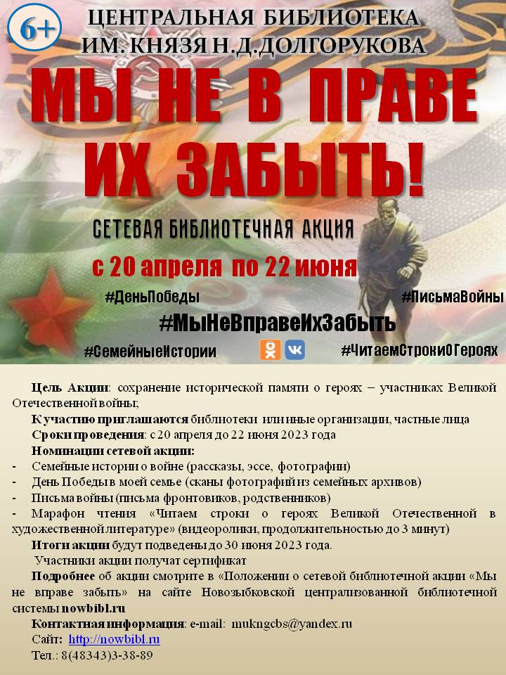 Центральная библиотека имени князя Н.Д.Долгорукова Муниципального бюджетного учреждения культуры «Новозыбковская централизованная библиотечная система» объявляет сетевую библиотечную Акцию «Мы не вправе их забыть!», посвященную 78-летию Победы в Великой Отечественной Войне.
