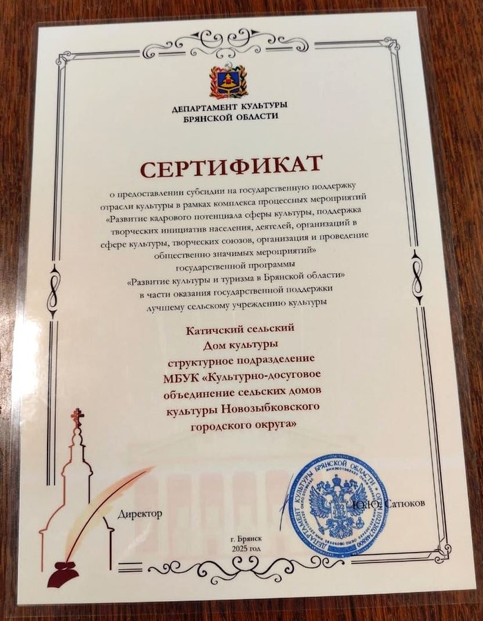 25 марта в Брянской областной филармонии прошел праздничный концерт, посвященный Дню работника культуры. Это было торжество, полное радости и признания заслуг тех, кто ежедневно делает культурную жизнь ярче и богаче. Среди них и наша землячка художественный руководитель Катичского сельского Дома культуры, который по итогам работы за 2024 год стал «Лучшим учреждением культуры, находящимся на территории сельских поселений». В качестве приза работники сельского Дома культуры получили сертификат, на 106 000 тысяч рублей, который будет потрачен на покупку одежды для сцены.