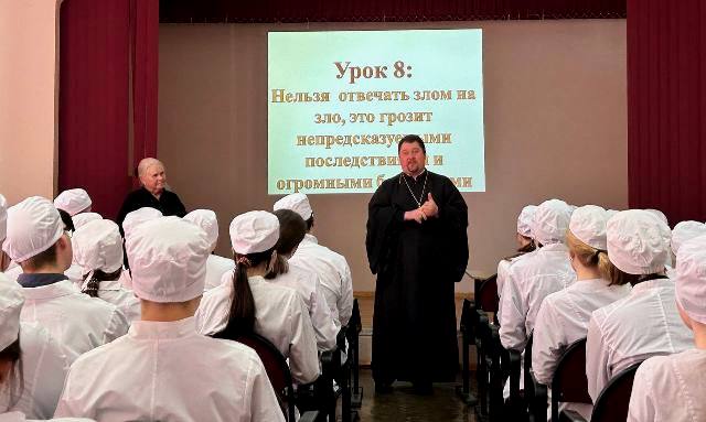 Продолжил мероприятий священник Новозыбковского Храма в честь Чуда Архистратига Михаила в Хонех иерей Серафим Похожай, который посоветовал молодым людям брать в руки Библию почаще, потому как в ней собрана вся мудрость, необходимая для нормальной жизни человеческой. Священник пожелал студентам, по собственной воле выбравшим белые одежды для будущего служения людям, честно и добросовестно пройти свое профессиональное поприще и подарил желающим маленькие иконы преподобного Паисия Величковского, имевшего от Бога особенный дар – направлять души людские ко спасению и враче¬вать их от страстей. |