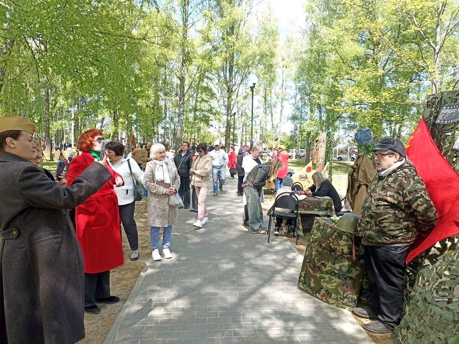 9 мая Центральная библиотека приняла активное участие в городском празднике, посвящённом Дню Победы. Патриотические мероприятия проходили в уютном сквере "Берёзовая роща", где была организована тематическая интерактивная площадка, посвященная памяти о Великой Отечественной войне. Одним из самых популярных мест на площадке стала фотозона "Солдатский привал". Здесь горожане могли сделать памятные снимки, примерив солдатскую шинель, каску, плащ-палатку на фоне солдатской атрибутики. Атмосфера настоящего военного времени привлекала внимание как детей, так и взрослых, создавая уникальные моменты для семейного альбома. Для всех желающих была проведена литературная викторина "Листая книги о войне", на которой участники могли проверить свои знания о событиях Великой Отечественной войны и её героях. Также была организована игра с тематическими филвордами "Армия. Народ. Победа", что позволило участникам углубить знания не только о войне, но и о значении этих непростых слов в нашей истории.