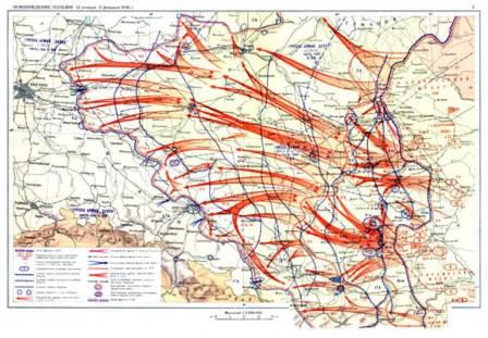 ВЫРУЧАЯ СОЮЗНИКОВ Начало наст упления советских войск в Польше намечалось на 20 января. Но 6 января в связи с крупной неудачей англо-американских сил в Арденнах премьер-министр Великобритании У. Черчилль обратился к И. В. Сталину с просьбой оказать помощь и срочно провести наступление «на фронте Вислы или где-нибудь в другом месте». Для поддержки союзников Ставке Верховного Главнокомандования пришлось ограничить время подготовки к Висло-Одерской операции, начало которой было перенесено на 12 января.