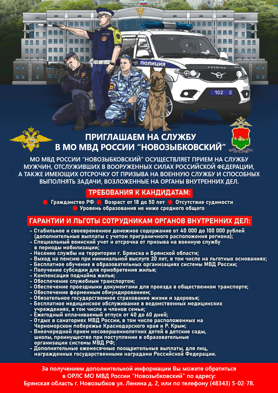 МО МВД России «Новозыбковский» приглашает на службу физически здоровых молодых людей в возрасте не моложе 18 лет до 50 лет на должности полицейского патрульно-постовой службы полиции, полицейского (водителя) группы обслуживания, инспектора-кинолога, полицейского отделения охраны и конвоирования подозреваемых и обвиняемых, инспектора службы группы режима специального приемника для содержания лиц, подвергнутых административному аресту, помощника оперативного дежурного дежурной части – имеющих среднее общее образование. Заработная плата от 31 000 рублей, а при условии добросовестного несения службы и положительных результатов работы до 50 000.