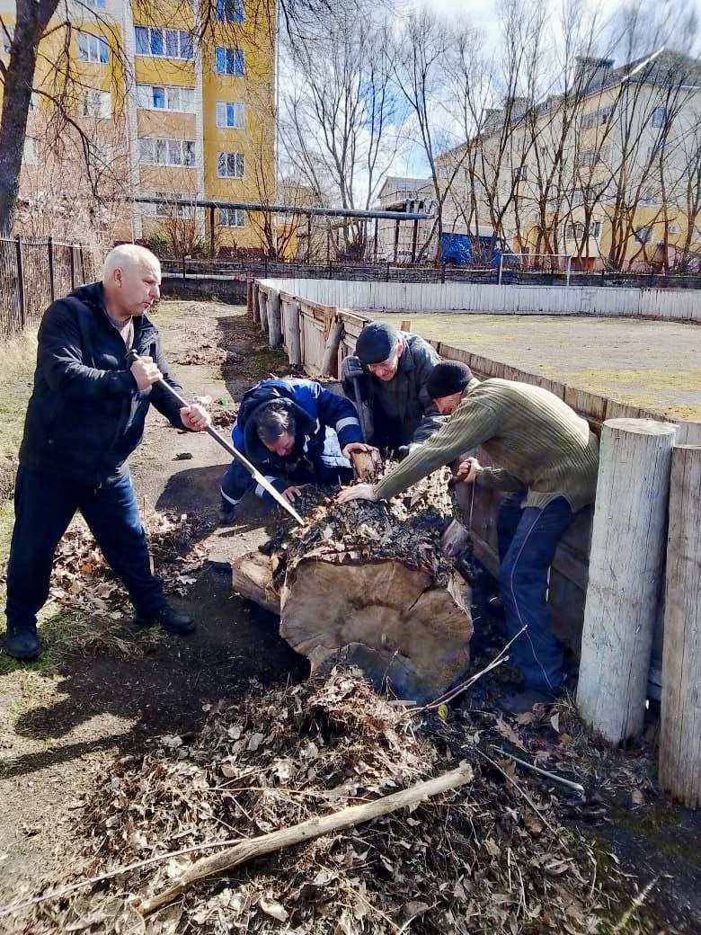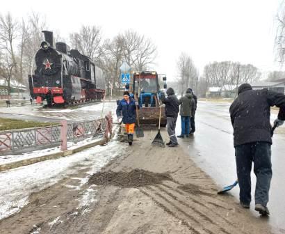 Совместными усилиями жителей, работников организаций, с применением специализированной техники, удалось провести уборку скверов, тротуаров от песка (грунта) и мусора, прилегающих участков к учреждениям и предприятиям.