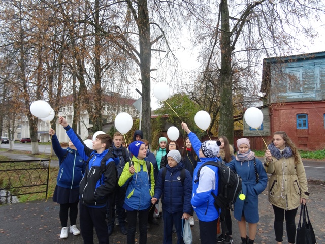 Завершилось мероприятие акцией: школьники с преподавателем и сотрудником библиотеки вышли на берег озера, чтобы отпустить в небо в память о погибших и умерших белые шары. |